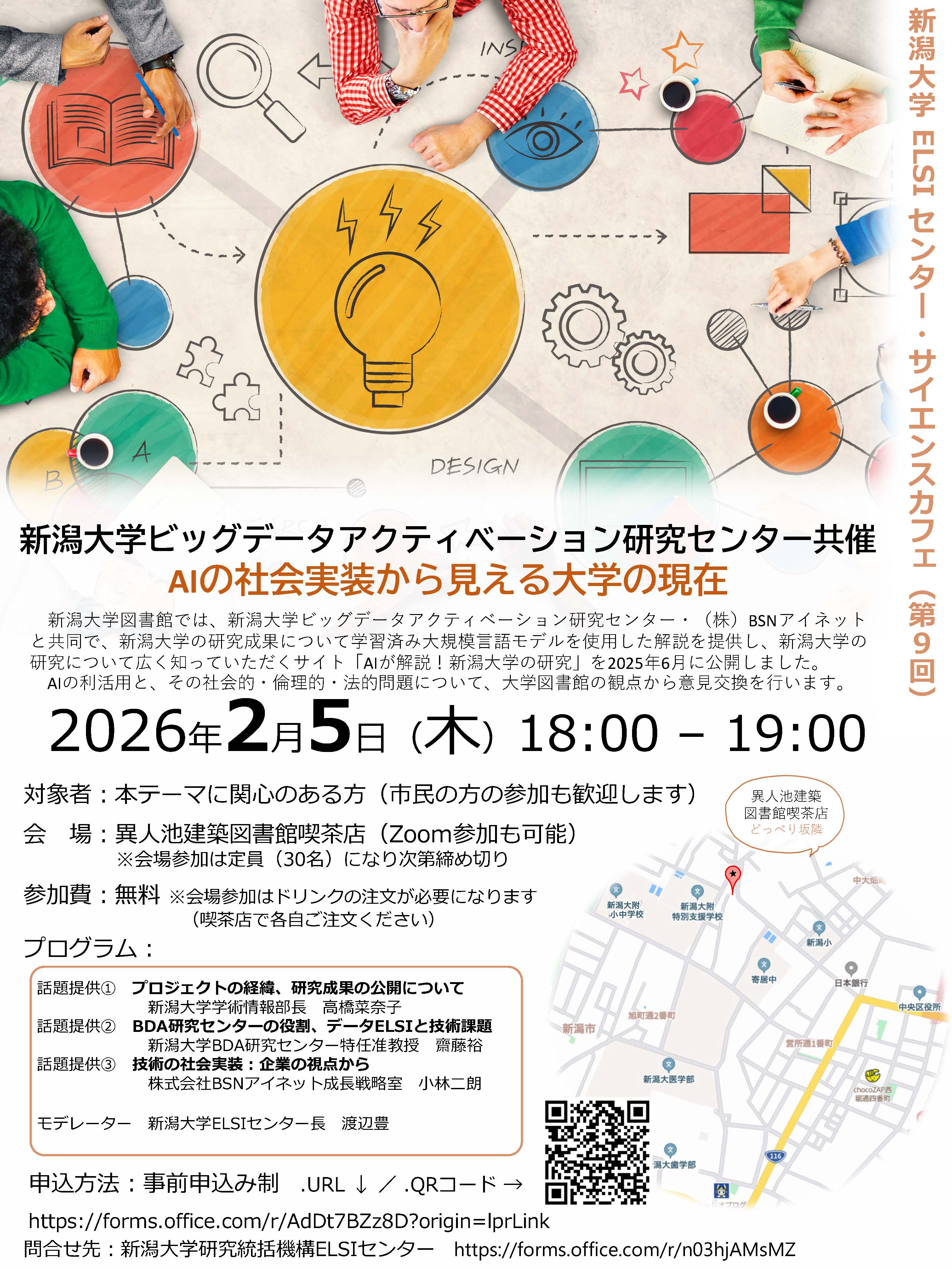 新潟大学研究統括機構ELSIセンターでは、新潟大学ビックデータアクティベーション研究センターとの共催により第9回サイエンスカフェ「AIの社会実装から見える大学の現在(いま)」を以下の要領で開催します。 学内外に広く参加者を募りますので、ご興味のある皆様のご参加をお待ちしております。