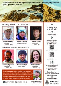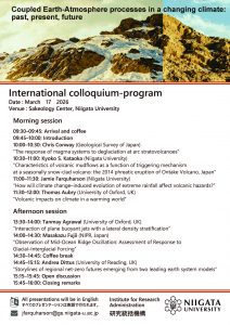 本コロキウムでは、“Coupled Earth-Atmosphere processes in a changing climate:past, present, future”の視点から、本分野に取り組む研究者が集い、現在の研究成果を共有するとともに、今後の学術的発展に資する議論を深めることを目的としています。あわせて、本学の学生および教職員が海外研究者と直接交流し、国際的な研究活動に触れる貴重な機会を提供いたします。